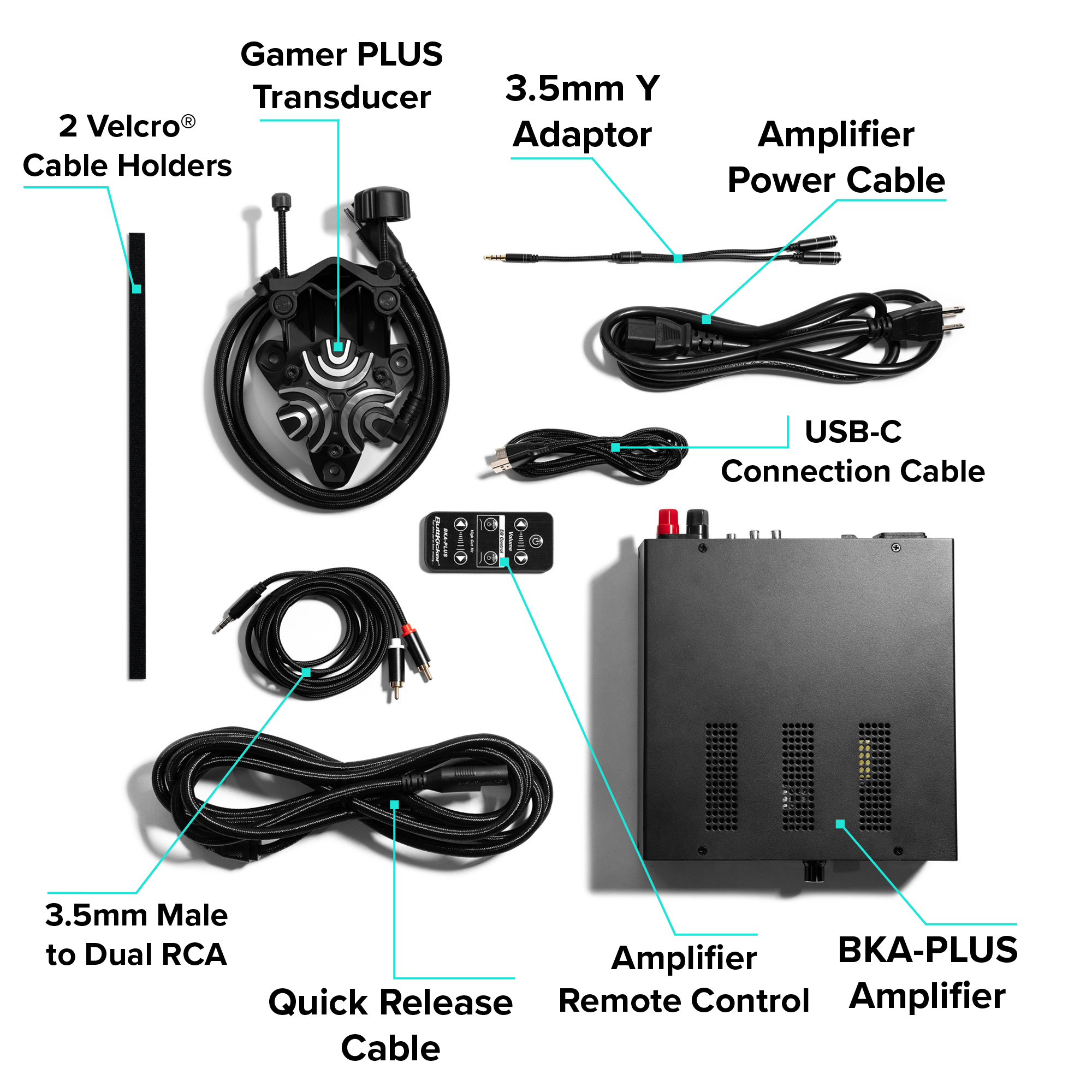 Zestaw system Gamer PLUS zawiera:Jeden (1) przetwornik dotykowy ButtKicker Gamer PLUS z mechanizmem mocowania Universal Clamp i wbudowanymi nóżkami montażowymiJeden (1) wzmacniacz mocy ButtKicker PLUS BKA-PLUSWszystko, czego potrzebujesz, aby podłączyć Gamer PLUS do swojej konfiguracji**Elementy montażowe nie są dołączone.