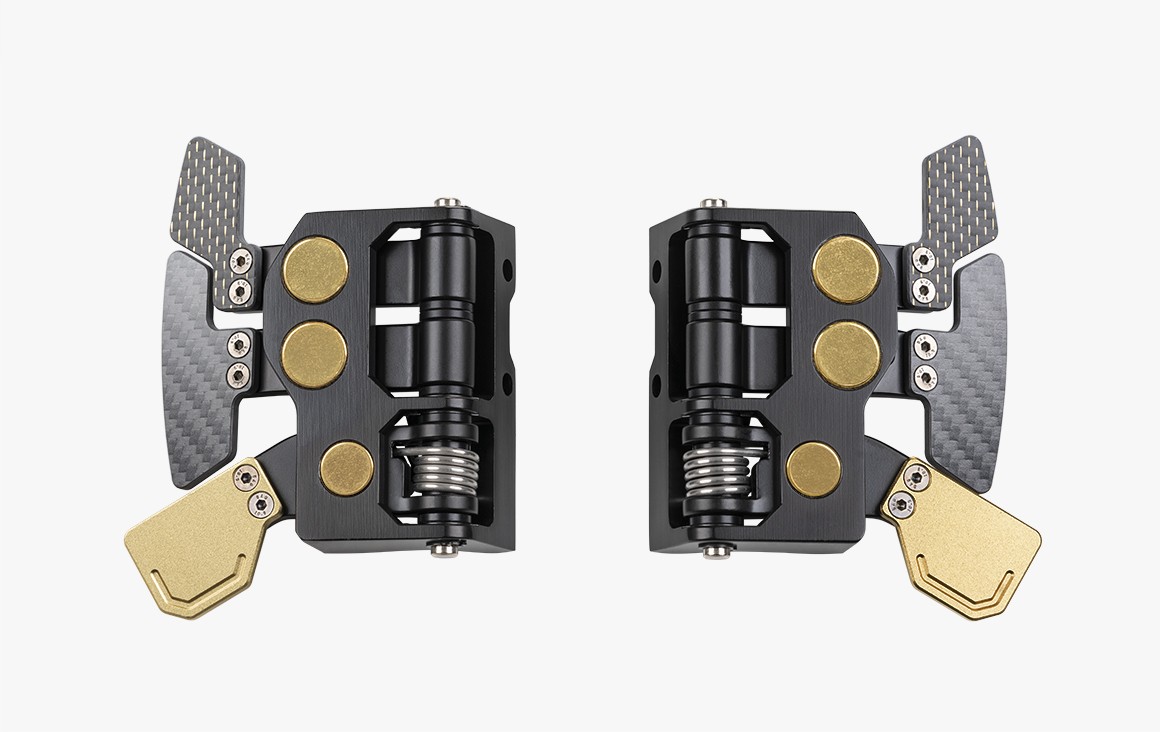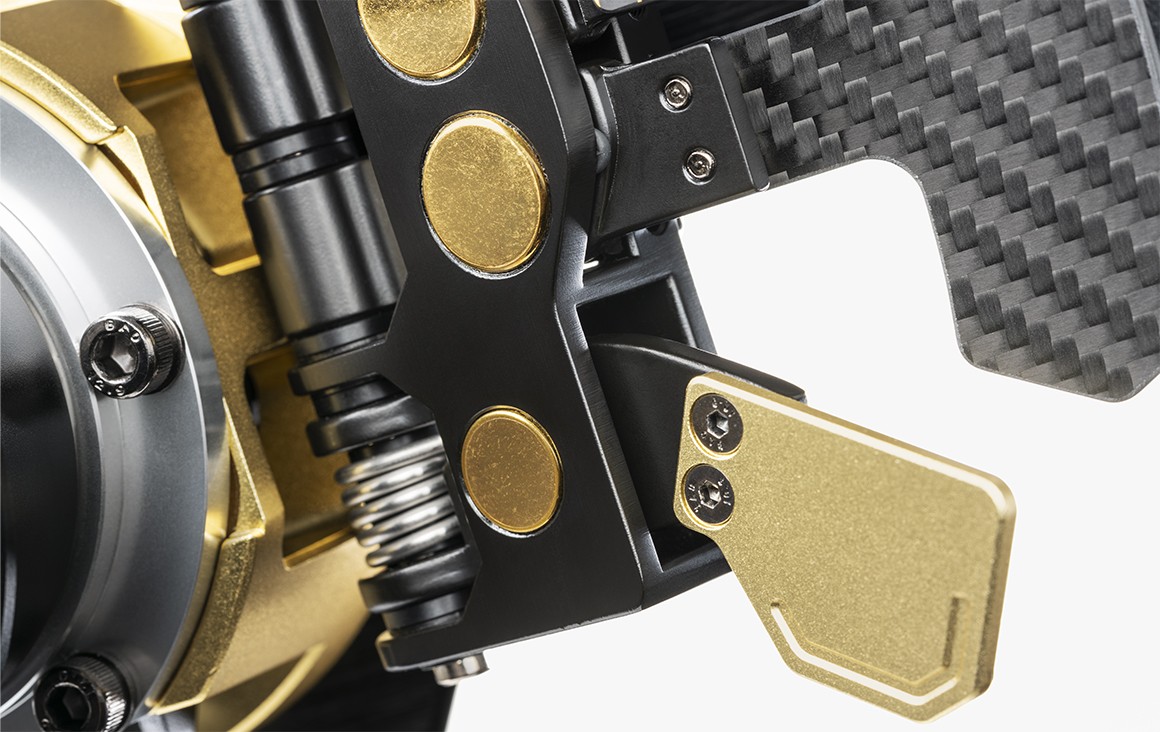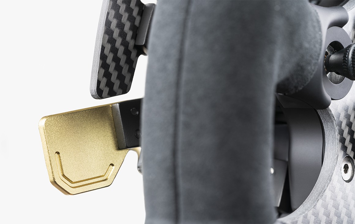 Obrabiana CNC aluminiowa klatka i 3-milimetrowe płytki łopatek z włókna węglowego w połączeniu z magnetycznymi manetkami zmiany biegów i podwójnymi analogowymi łopatkami tworzą autentyczny mechanizm najwyższej jakości.