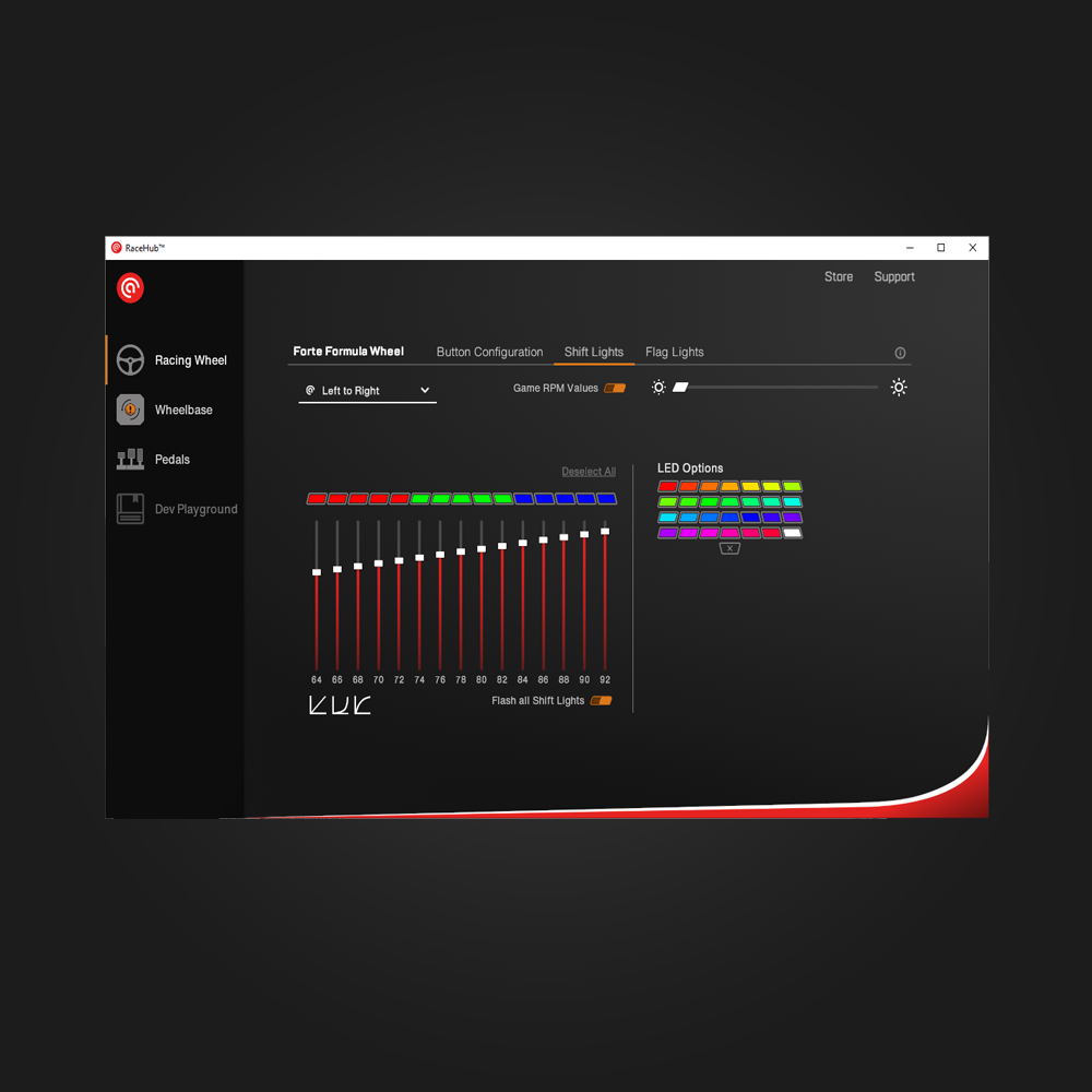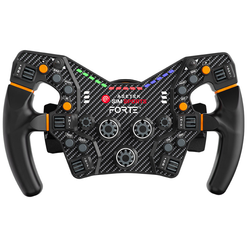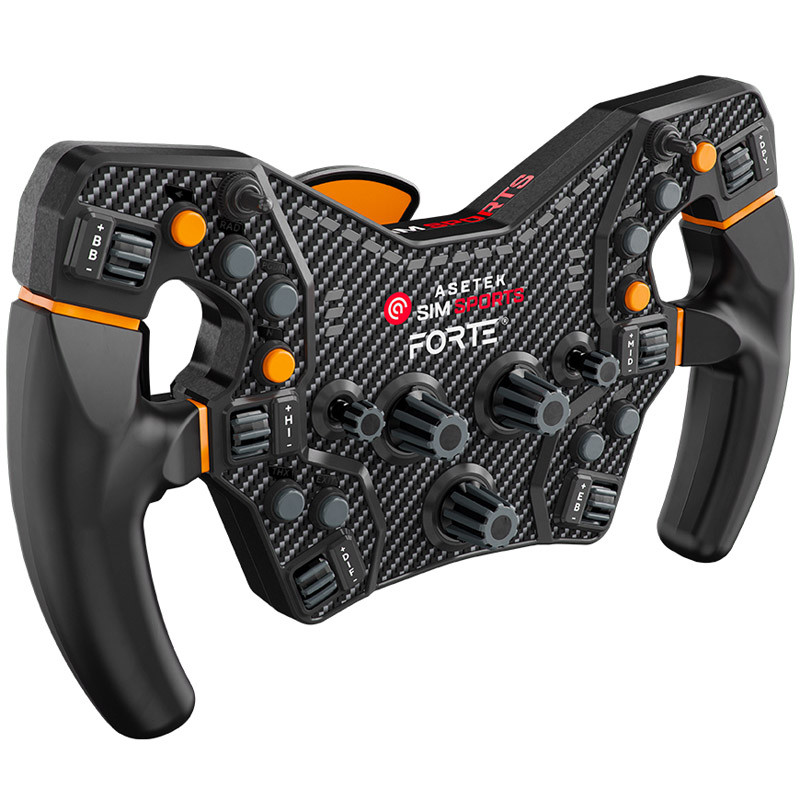 Ergonomiczne uchwyty są wykonane z wygodnej, miękkiej i wytrzymałej gumy silikonowej, która jest łatwa do czyszczenia i dezynfekcji oraz zapewnia najwyższy komfort i kontrolę, niezależnie od tego, czy nosisz rękawice wyścigowe, czy nie. Będziesz mieć możliwość łatwej zmiany uchwytów, aby szybko wprowadzić przyszłe ulepszenia, w tym kolor, rozmiar, kształt i twardość.Przód kierownicy jest wykonany z 2-milimetrowej plecionej płyty węglowej, która zapewnia piękne miejsce na wszystkie przyciski i przełączniki.Dzięki 128 indywidualnym opcjom wprowadzania, kierownica Asetek Simsports ® Forte ® Formula, za pośrednictwem naszego RaceHub ™, da ci możliwość dostosowania i zmapowania wszystkich przycisków, przełączników, enkoderów i manetek, których potrzebujesz, aby być na szczycie swojej gry. Wyposażony w 12 przycisków, dwa 2-kierunkowe przełączniki dwupozycyjne i dwa 7-kierunkowe przełączniki kinky, trzy enkodery obrotowe i sześć enkoderów obsługiwanych kciukiem, możesz kontrolować wszystkie żądane ustawienia.Wszystkie przyciski, przełączniki i pokrętła spełniają najwyższe standardy jakości oraz są w pełni przetestowane i zatwierdzone w naszych zautomatyzowanych maszynach do testowania przycisków, aby zapewnić wieloletnie niezawodne codzienne użytkowanie.Z tyłu znajdują się domyślnie dwie bezdotykowe magnetyczne łopatki zmiany biegów, umożliwiające szybką i płynną zmianę biegów. Koło można łatwo rozbudować do dwusprzęgłowego, co zapewnia doskonałe starty w wyścigach, a także dwie dodatkowe łopatki z możliwością mapowania, których można na przykład używać do łatwego wyprzedzania i aktywacji DRS. Wszystkie łopatki i związana z nimi mechanika są, podobnie jak sama rama koła, formowane wtryskowo z ultralekkiego i sztywnego kompozytu węglowego.Kierownica Forte ® zawiera nie mniej niż 49 w pełni konfigurowalnych diod LED ARGB, w tym świateł obrotowych i flagowych – co pozwala nie tylko dostosować wygląd kierownicy, ale także pomóc w podejmowaniu decyzji w ułamku sekundy, które mogą mieć wpływ na sukces lub porażkę. Diody LED można oczywiście regulować, przyciemniać, dostosowywać kolorystycznie i mapować w RaceHub™, z wieloma innymi funkcjami, które będą dostępne. Każdy przycisk i diodę LED można wyraźnie oznaczyć za pomocą dostarczonego arkusza naklejek, co daje podświetloną etykietę dla każdej funkcji na kole.