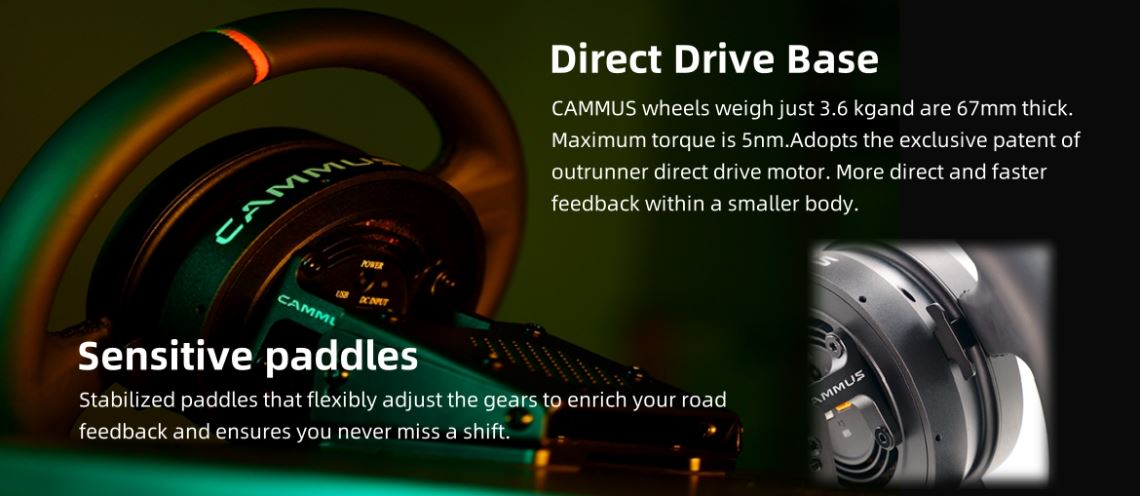 W przypadku kierownicy Cammus C5 producent postawił na specjalną koncepcję. Zamiast zwykłego silnika, w tej kierownicy zintegrowany jest silnik. Cammus nie wymaga oddzielnej bazy z Force Feedback i pozwala zaoszczędzić dużo miejsca. Dzięki oddzielnie dostępnemu zaciskowi stołowemu kierownicę i silnik z Direct Drive można zamontować na biurku.