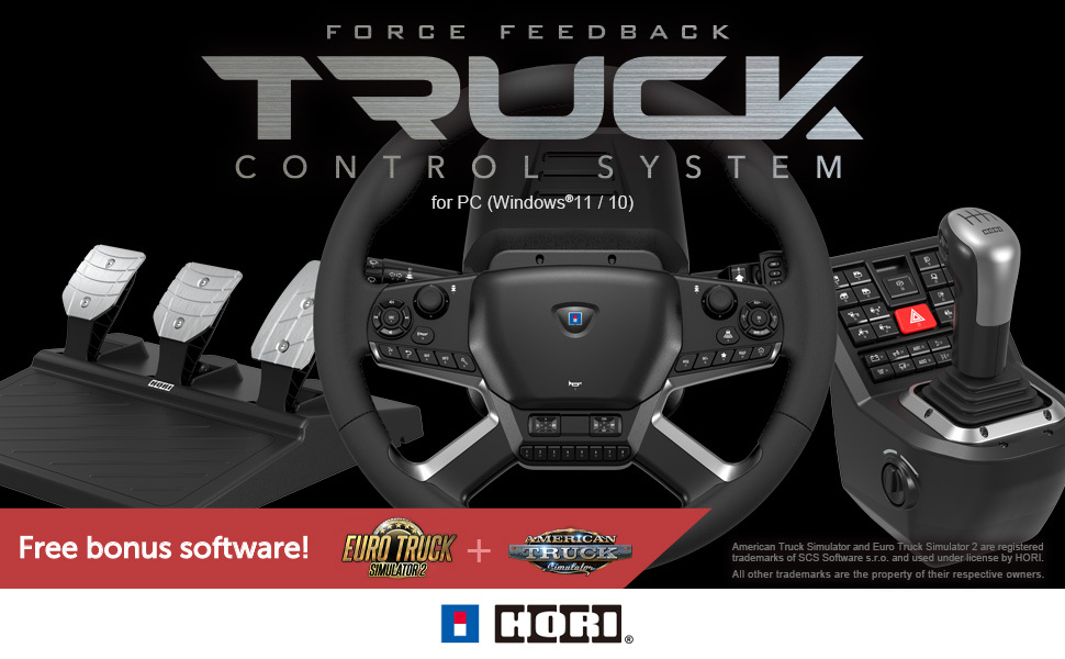 Zasiądź za kierownicą swojego własnego dużego zestawu dzięki systemowi sterowania ciężarówką z Force Feedback HORI Force Feedback na komputer PC. Wyposażony w pełnowymiarowe koło pasujące do tych, które można znaleźć w rzeczywistych ciężarówkach! Podwójne sprzężenie zwrotne siły silnika zapewnia niezrównany realizm i wyczucie kierownicy podczas skręcania i poruszania się po różnych nawierzchniach. Dodatkowe elementy sterujące na pokładzie obejmują lewą i prawą dźwignię do sterowania reflektorami i hamulcami. Solidne, metalowe pedały z bezdotykowymi czujnikami magnetycznymi zapewniają niesamowitą dokładność i wyjątkową trwałość. Ciesz się otwartą drogą dzięki systemowi sterowania ciężarówką z Force Feedback firmy HORI!