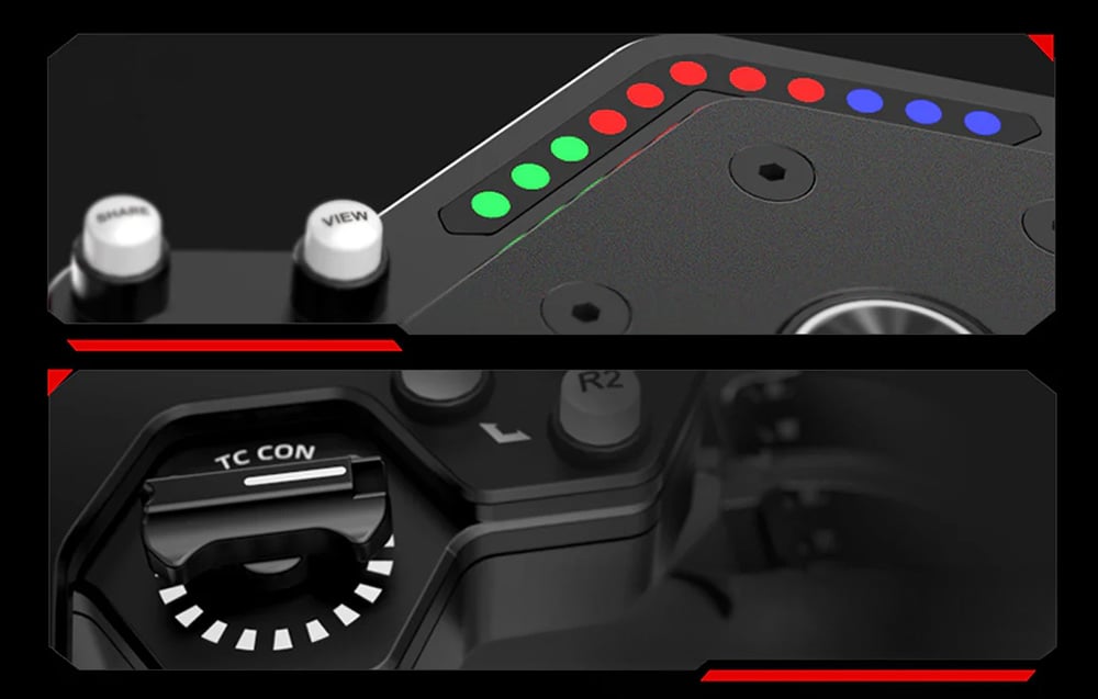 Kierownica oferuje 11 konfigurowalnych diod RGB, które mogą działać jako wskaźnik obrotów silnika lub efekt świetlny dla większej immersji. 20-pozycyjny enkoder z funkcją wciskania pozwala na szybkie dostosowanie balansu hamulców, ABS, czy kontroli trakcji. Do tego dochodzi 13 programowalnych przycisków, które w połączeniu z oprogramowaniem PXN SimRacing można dowolnie przypisać – od sterowania kamerą po strategię pit-stopów.