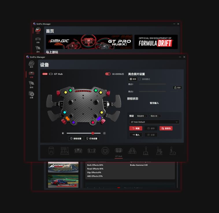 Oprogramowanie Next Gen Driver: SimPro Manager. Przyciski RGB migają i zmieniają kolory w zależności od ustawień telemetrii „ABS/TC/DRS/PIT”. Dostosuj własne wrażenia z wyścigów GT.