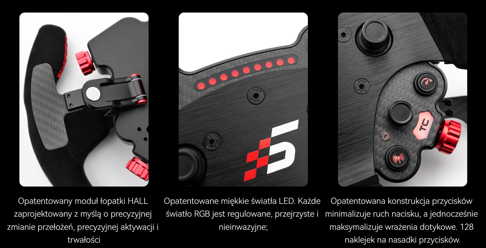 Nowe wzornictwo przycisków, które minimalizuje ruch, ale maksymalizuje wyraźne odczucie. 325-milimetrowa ścięta górna część kierownicy zaprojektowana dla optymalnej widoczności wskaźników. 1 światło przeciwmgłowe LED z 9 diodami LED. 8 konfigurowalnych przycisków RGB. 2 obrotowe enkodery kciukowe dla ułatwienia dostępu. 2 enkodery RGB dla TC i ABS; Wszystkie światła RGB można programować za pomocą najnowszego oprogramowania sterownika: SimPro Manager