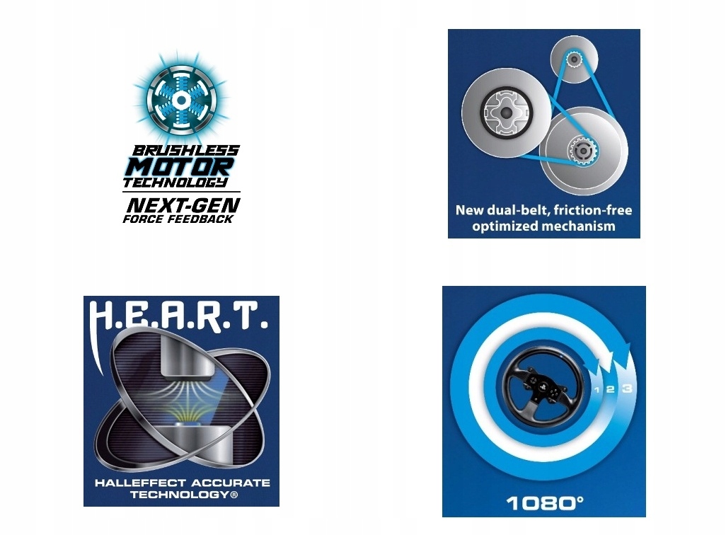 Inżynierowie firmy Thrustmaster rozszerzyli imponujące możliwości silnika urządzenia przez zapewnienie wysokiej precyzji. Jej źródłem jest technologia H.E.A.R.T. (HallEffect AccuRate Technology®), obejmująca bezstykowy czujnik magnetyczny. Pozwala ona uzyskać 16-bitową rozdzielczość, czyli 65 536 wartości odchylenia odczytywanych przez kierownicę.