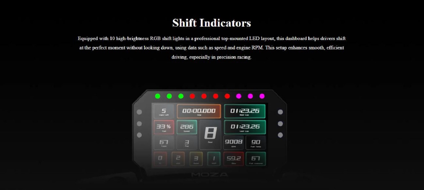Wyposażony w 10 jasnych świateł zmiany biegów RGB w profesjonalnym układzie LED montowanym na górze, ten panel pomaga kierowcom zmieniać biegi w idealnym momencie bez patrzenia w dół, wykorzystując dane, takie jak prędkość i obroty silnika. Ta konfiguracja poprawia płynną, wydajną jazdę, szczególnie w precyzyjnych wyścigach.