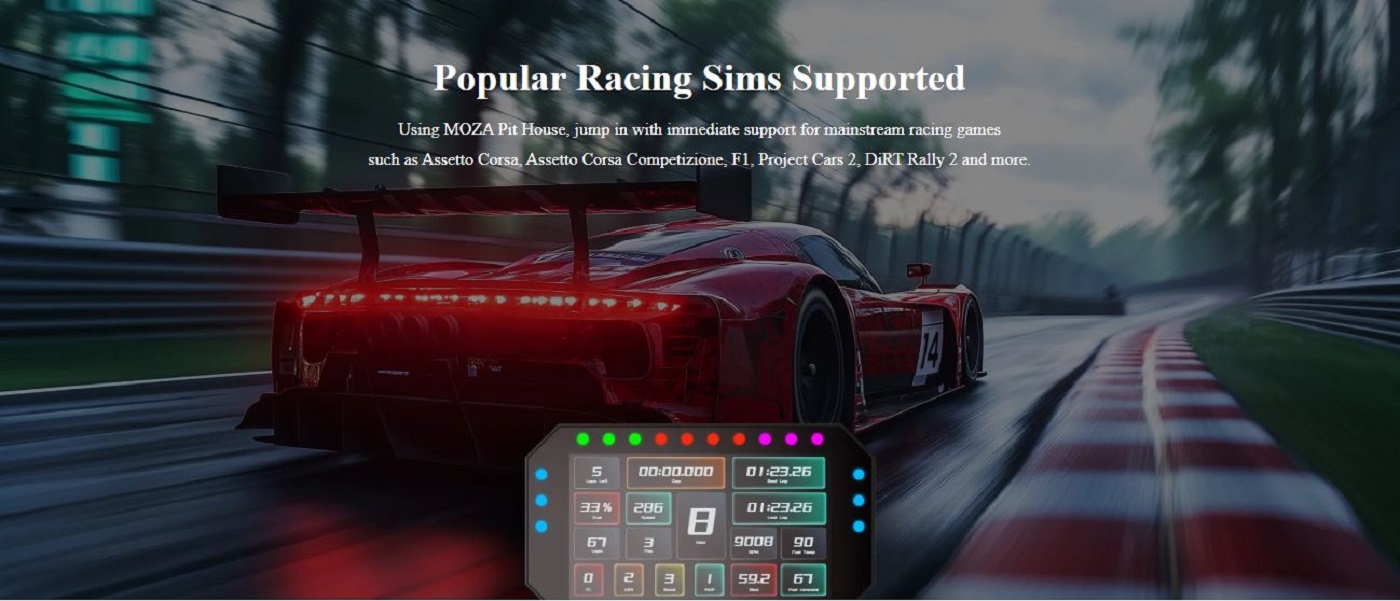 Używając MOZA Pit House, możesz natychmiast uzyskać wsparcie dla popularnych gier wyścigowych,takich jak Assetto Corsa, Assetto Corsa Competizione, F1, Project Cars 2, DiRT Rally 2 i innych.