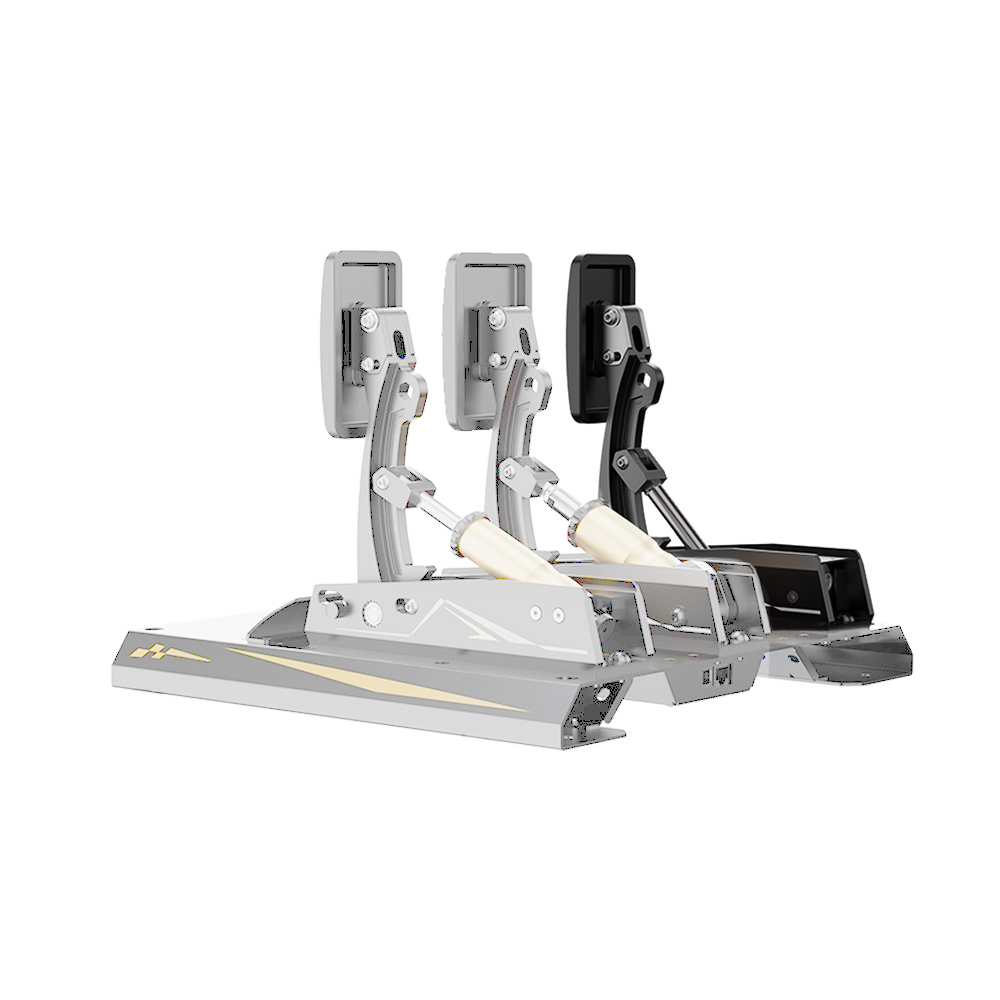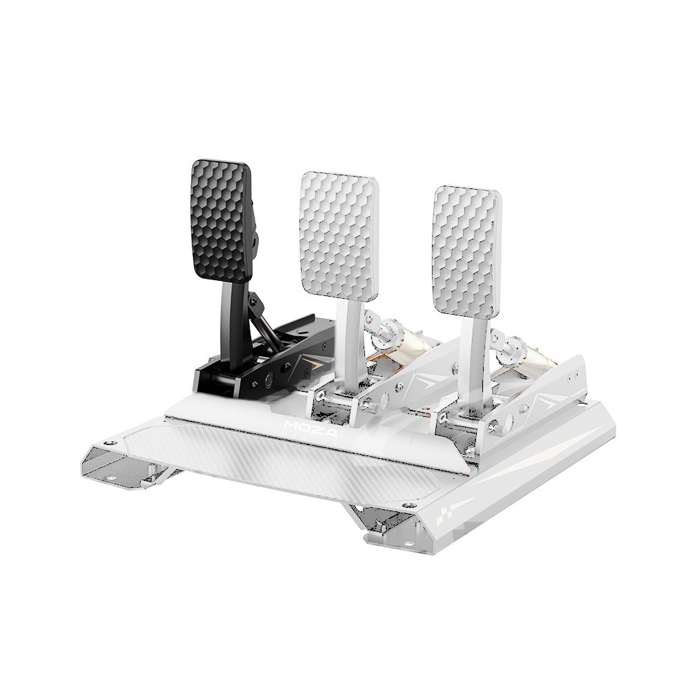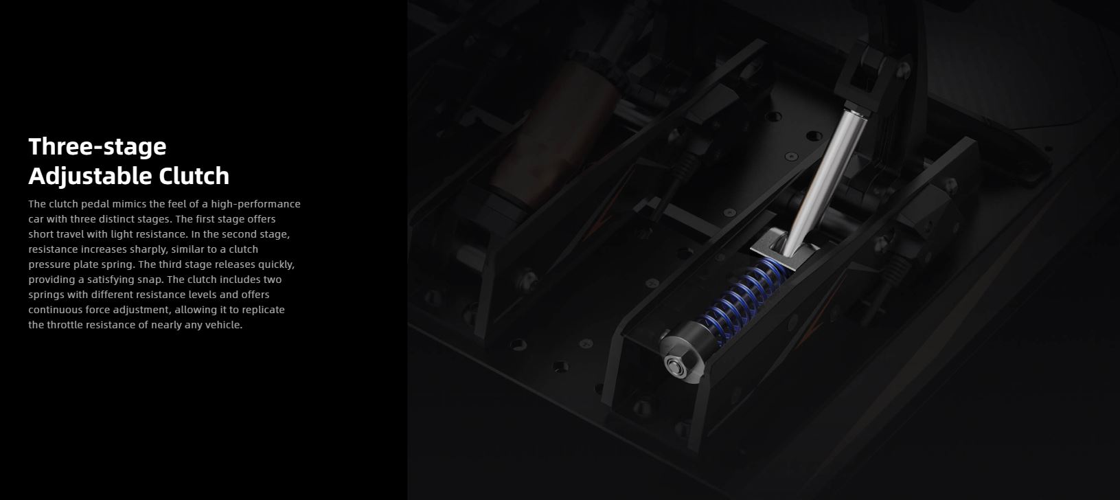 Pedał sprzęgła naśladuje wrażenia z jazdy samochodem o wysokiej wydajności z trzema odrębnymi etapami. Pierwszy etap oferuje krótki skok z lekkim oporem. W drugim etapie opór gwałtownie wzrasta, podobnie jak sprężyna docisku sprzęgła. Trzeci etap zwalnia się szybko, zapewniając satysfakcjonujące kliknięcie. Sprzęgło obejmuje dwie sprężyny o różnych poziomach oporu i oferuje ciągłą regulację siły, co pozwala mu odtworzyć opór przepustnicy niemal każdego pojazdu.
