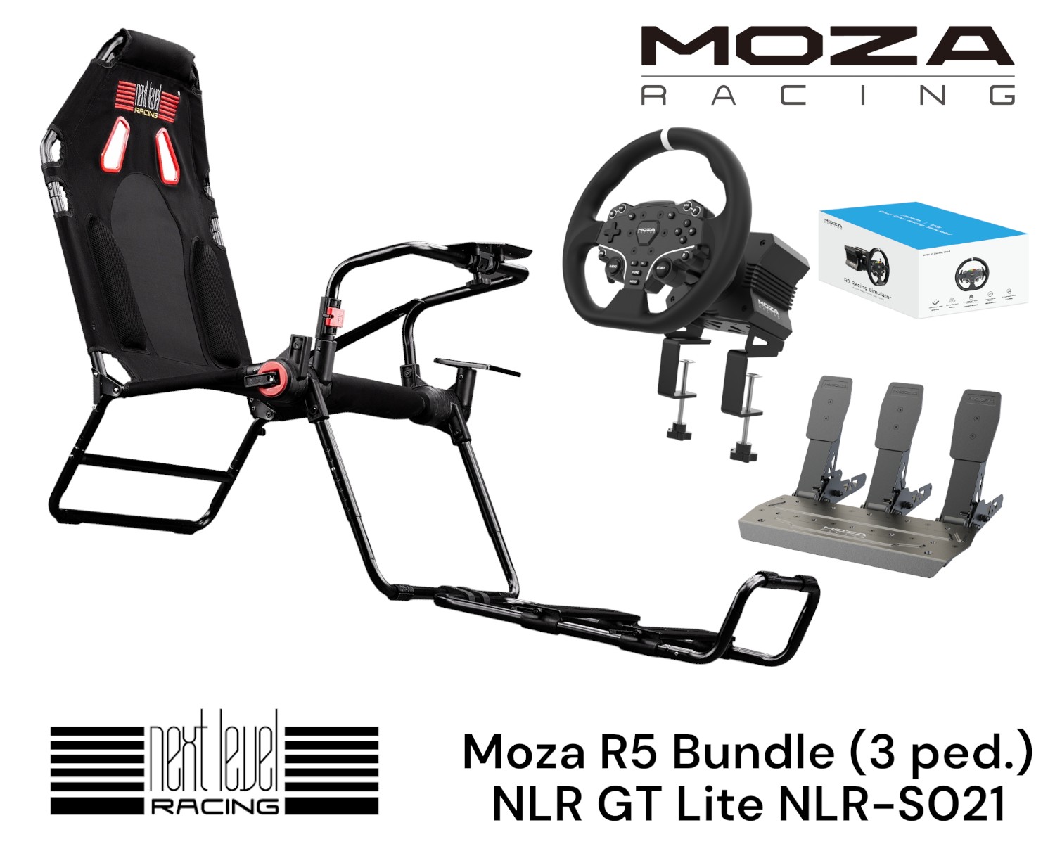 - Zestaw Kierownicy z pedałami MOZA R5 Bundle RS20 – w skład zestawu wchodzi baza R5, zestaw dwóch pedałów SR-P Lite, obręcz ES, uchwyt mocujący do blatów