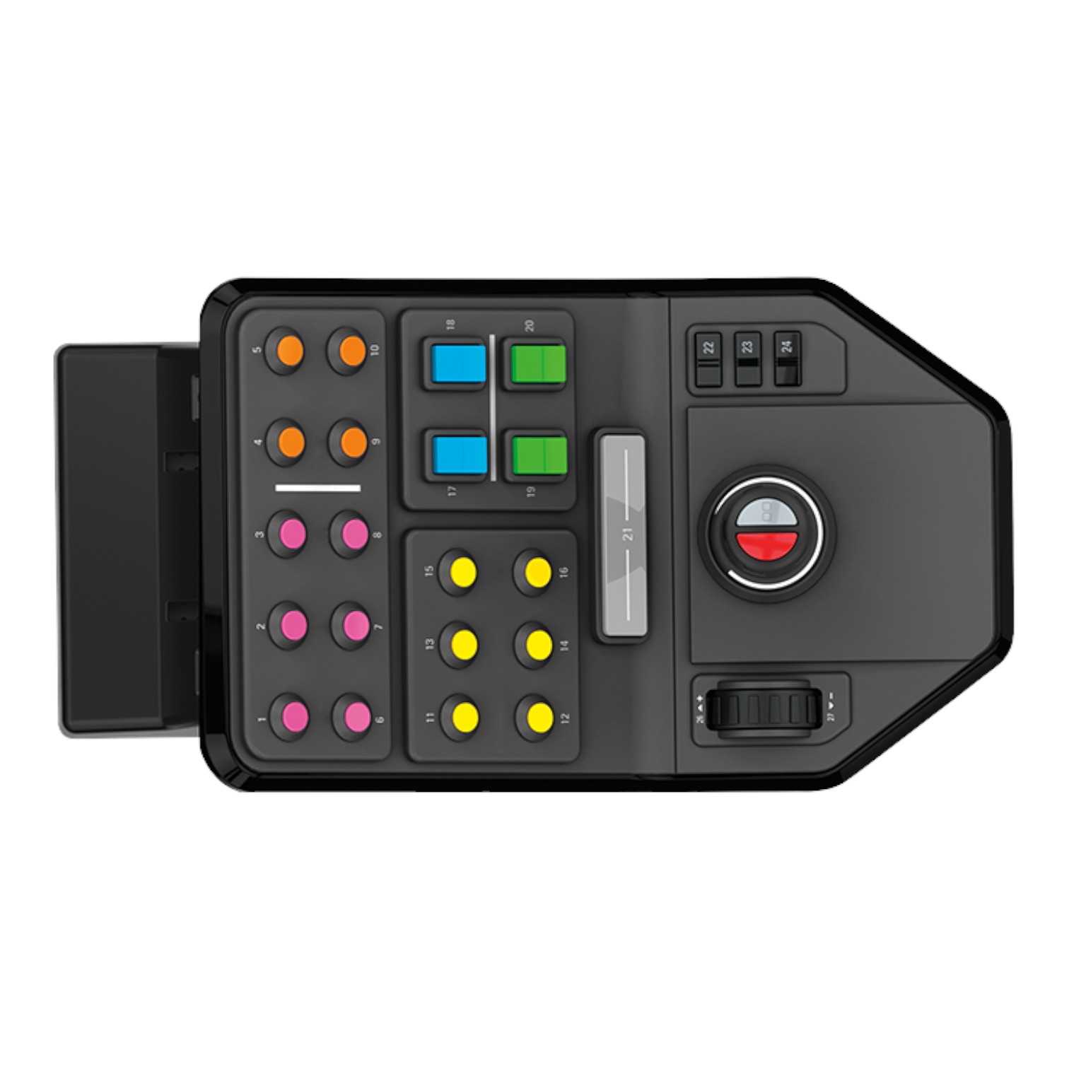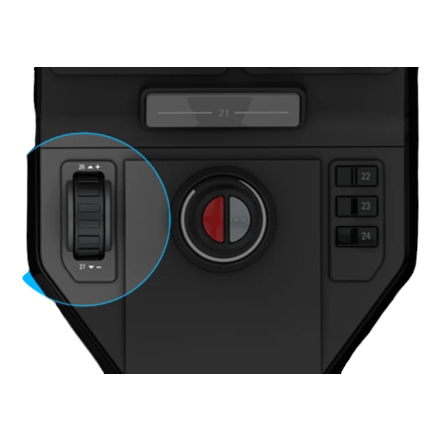 Realistyczny drążek przedniej ładowarki. Uzyskaj wrażenie pełnej kontroli nad ciężkim sprzętem, takim jak maszyny do pozyskiwania drewna, dźwigi, piły łańcuchowe, rozdrabniacze, przyczepy i nie tylko. Drążek ładowarki obsługuje osie pionową, poziomą i obrotu, podczas gdy przełącznik trybów podwaja liczbę dostępnych poleceń, co zapewnia łącznie sześć osi.