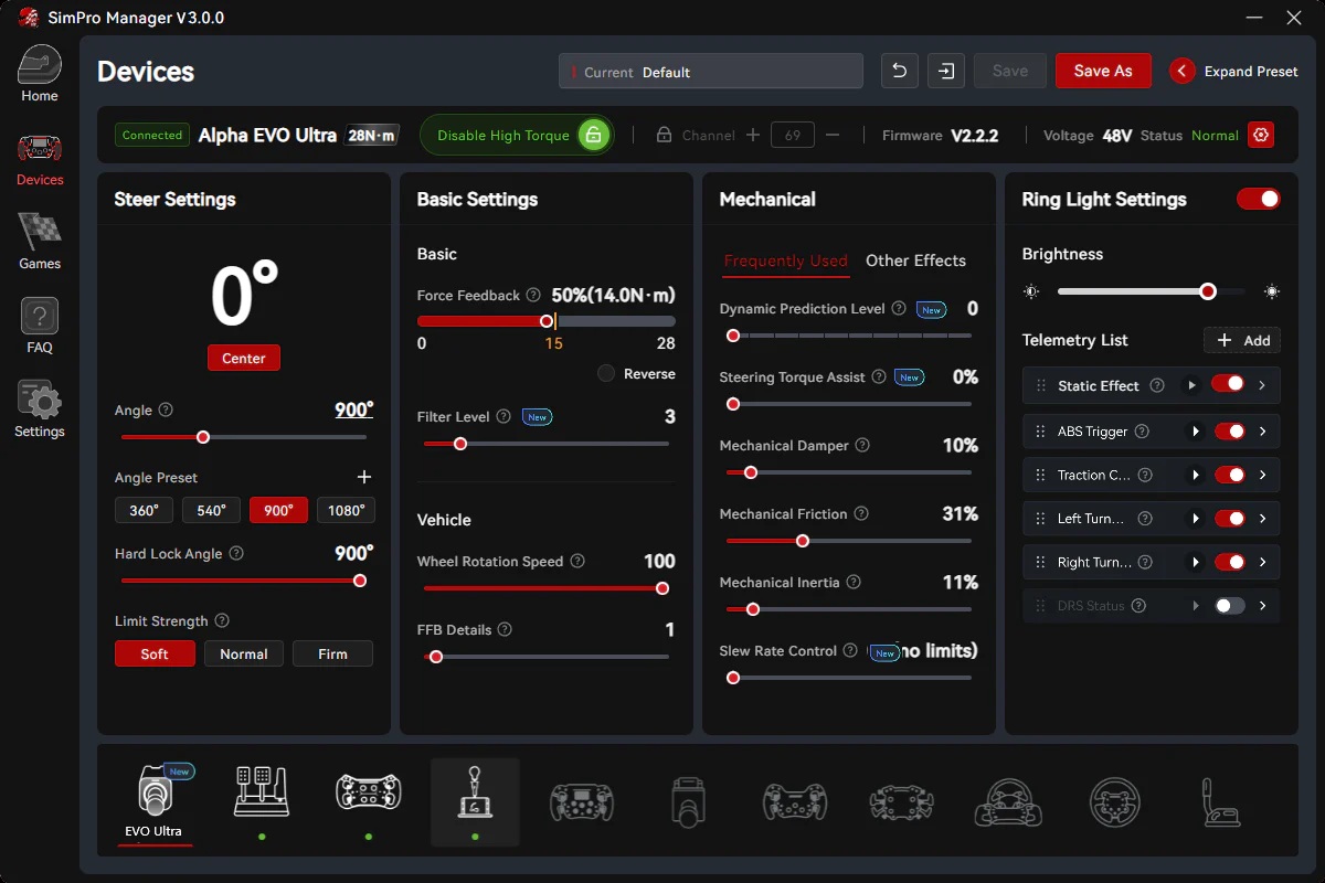 Wraz z EVO Ultra i P700 debiutuje SimPro Manager V3.0.0 , najnowsza wersja oprogramowania sterującego SIMAGIC. Zachowując znane już sterowniki przepływu pracy, SimPro Manager V3.0.0 wprowadza głębszą personalizację i większą kontrolę nad zachowaniem sprzętu na torze.