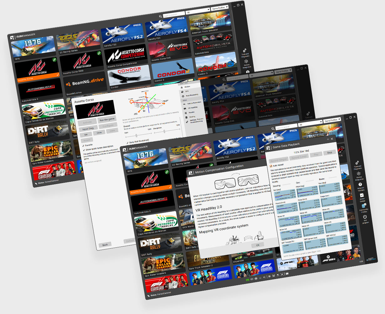 Qubic Manager to autorskie, profesjonalne i specjalistyczne oprogramowanie do platform ruchu. Jest kompatybilne z wszystkimi najpopularniejszymi grami wyścigowymi i lotniczymi na PC i stale aktualizowane, aby wspierać nowe tytuły w miarę ich pojawiania się na rynku. Qubic Manager to wydajny silnik, a jednocześnie prosty w obsłudze, pozwalający na łatwą regulację poziomów ruchu, wstrząsów, przechyłów i pochylenia jednym kliknięciem przycisku.