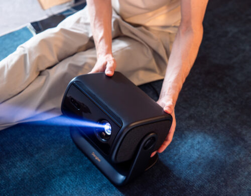 Wbudowany uchwyt typu gimbal pozwala na obrót projektora w zakresie 360° w poziomie oraz pochylenie 135° w pionie, umożliwiając swobodne ustawienie w niemal każdej przestrzeni.