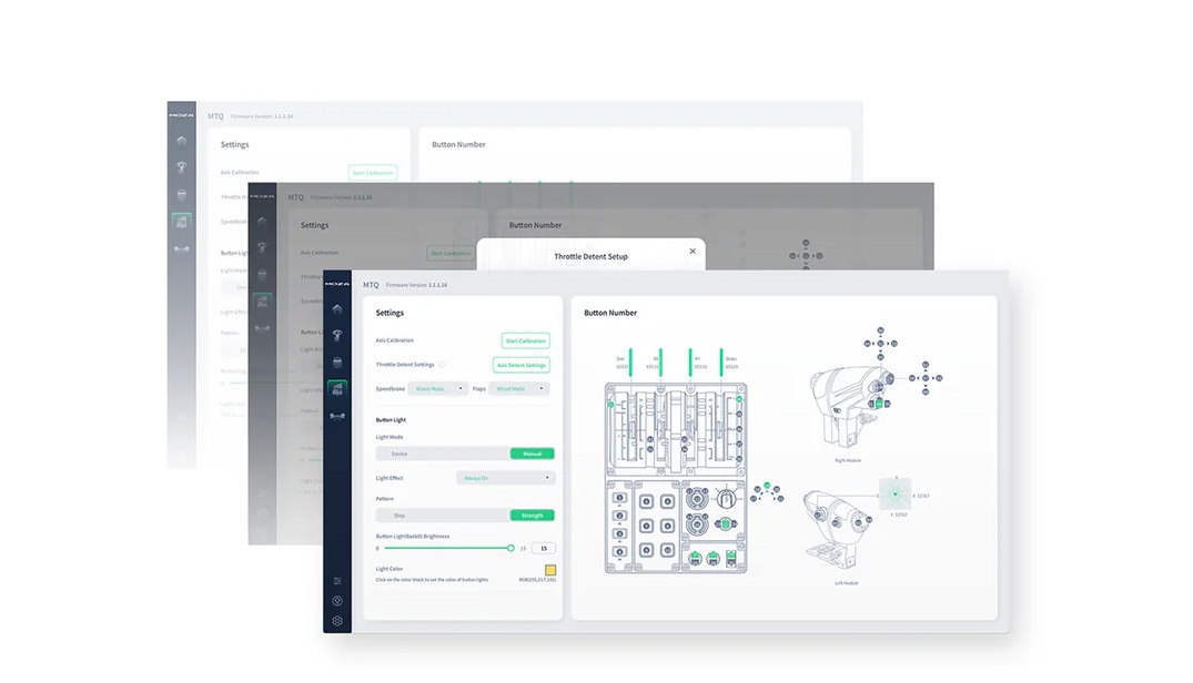 MTQ obsługuje wymienne moduły przepustnicy w stylu myśliwców, Airbusów i Boeingów. Każdy z nich został zaprojektowany z uwzględnieniem autentycznej ergonomii i mechanizmów zapadkowych: moduł myśliwski zapewnia precyzję porównywalną z HOTAS dzięki zapadkom dopalacza, moduł Airbusa odtwarza ciąg wsteczny i haptyczny Force Feedback, a moduł Boeinga oferuje wydłużony zakres ruchu do przodu, dźwignię odwrócenia ciągu od ramienia do podnoszenia oraz przycisk TO/GA dla realistycznych procedur.
