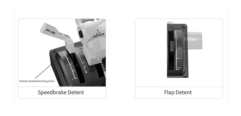 Cztery niezależne osie z wbudowanymi zapadkami zapewniają precyzyjną kontrolę hamulca aerodynamicznego, klap i przepustnicy. Konfigurowalne wirtualne przyciski zapadkowe i mechaniczne ograniczniki zapewniają namacalną, realistyczną precyzję.