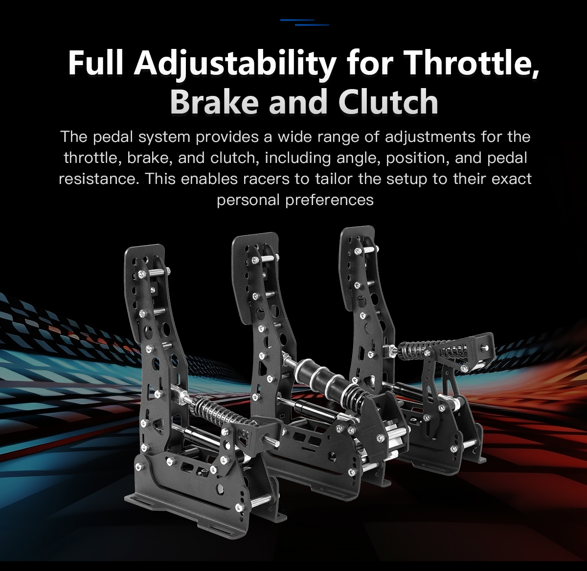 System pedałów zapewnia szeroki zakres regulacji przepustnicy, hamulca i sprzęgła, w tym kąt, położenie i opór pedałów. Dzięki temu zawodnicy mogą dostosować ustawienia do swoich indywidualnych preferencji.