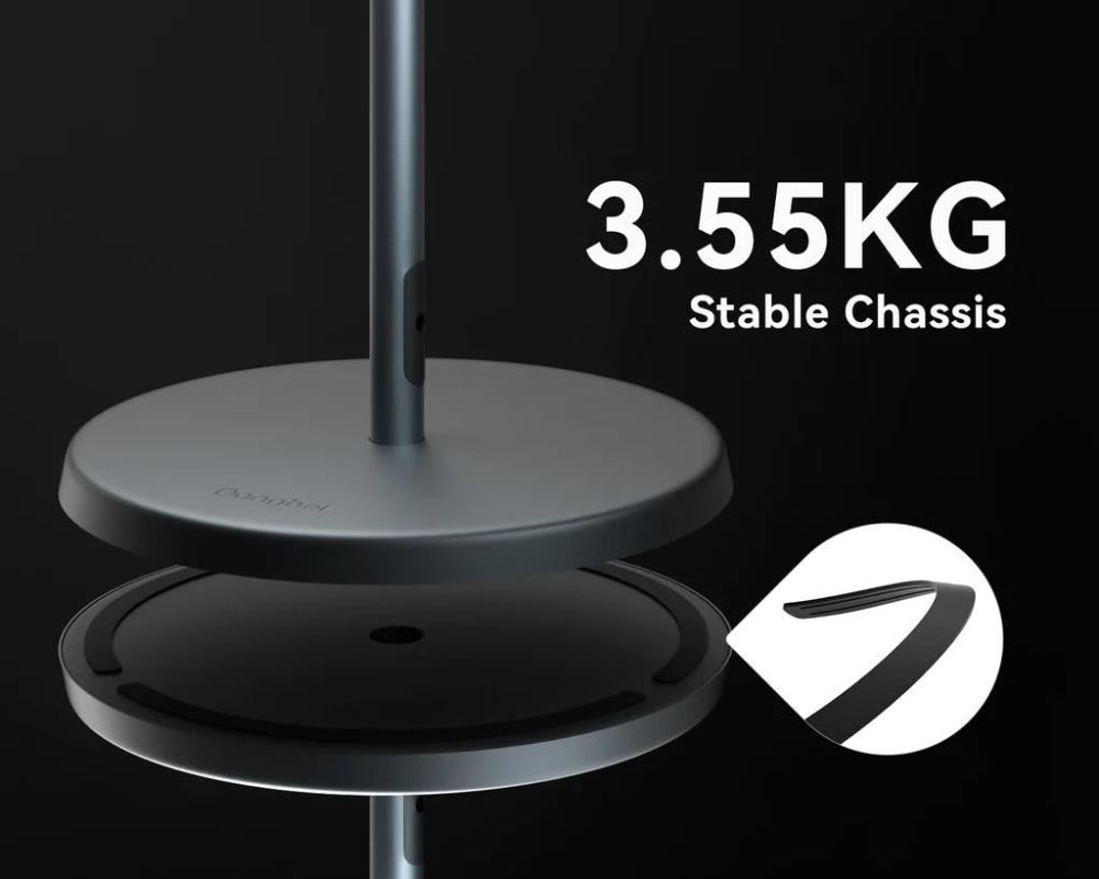 Wytrzymały stojak o wadze 3,55 kg ma na spodzie trzy zakrzywione silikonowe paski zapobiegające przewróceniu się.