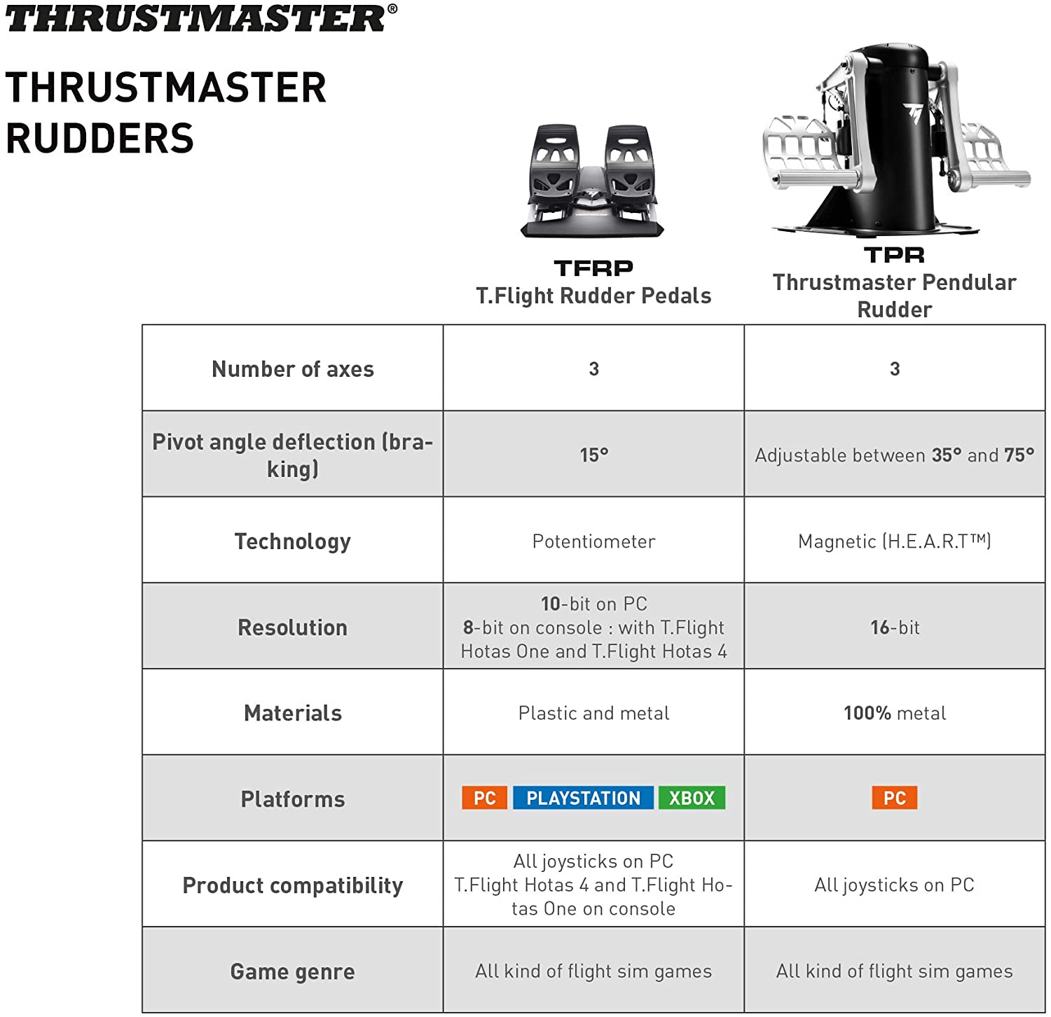 Thrustmaster z przyjemnością przedstawia TPR , specjalistyczny układ steru kierunku przeznaczony do symulatorów lotu, który udostępnia opracowaną przez Thrustmaster technologię PENDUL_R, czyli wyjątkowy, rewolucyjny mechanizm zapewniający płynne i równomierne ruchy. W połączeniu z magnetycznymi czujnikami hallotronowymi 3D używanymi w technologii Thrustmaster H.E.A.R.T. (HallEffect AccuRate Technology) mechanizm PENDUL_R zapewnia doskonałą precyzję, nawet w przypadku drobnych korekt. Ster kierunku TPR zawiera dwa bardzo precyzyjne hamulce różnicowe cechujące się idealnym rozkładem siły hamowania. Wykonanie w całości z metalu oraz technologia H.E.A.R.T. (HallEffect AccuRate Technology) zapewniają trwałość i precyzję niezmniejszającą się z upływem czasu. Urządzenie TPR jest zgodne na komputerze PC ze wszystkimi grami-symulatorami lotu (samoloty wojskowe i cywilne, pasażerskie, helikoptery) oraz kompatybilne z opracowaną przez Thrustmaster zaawansowaną aplikacją do programowania T.A.R.G.E.T. (Thrustmaster Advanced pRogramming Graphic EdiTor), za pomocą której można ładować lub definiować odrębne profile do poszczególnych gier oraz łączyć osie steru kierunku TPR z osiami joysticków Thrustmaster HOTAS, tworząc kompletne profile systemowe.