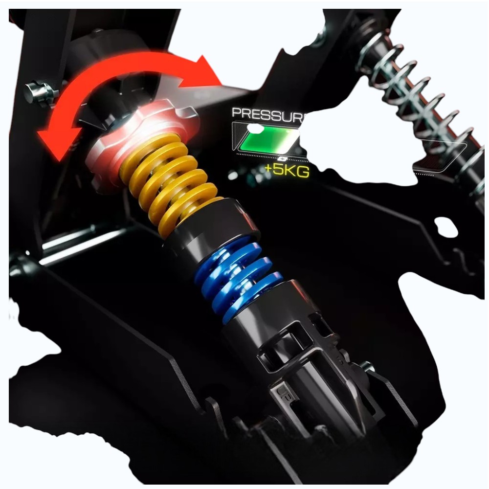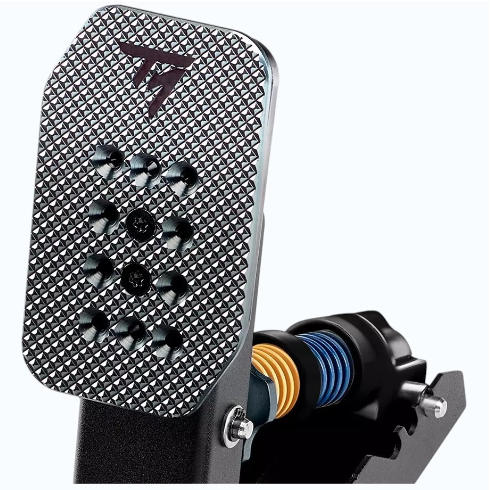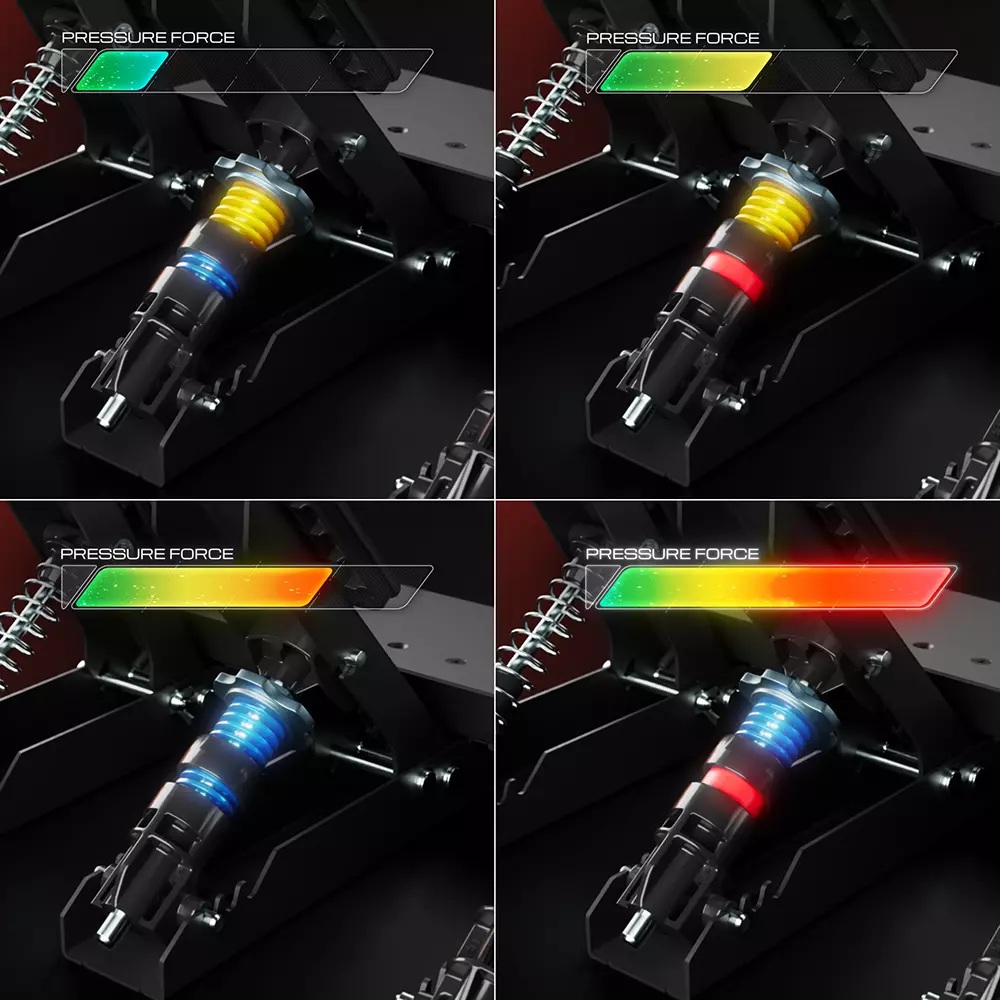 Pedał hamulca oferuje cztery wszechstronne konfiguracje, umożliwiając łatwą regulację maksymalnej siły nacisku od 25 do 100 kg bez użycia narzędzi, dzięki trzem dołączonym sprężynom i elastomerowi. Pokrętło napięcia wstępnego pozwala na precyzyjną regulację siły nacisku w krokach co ±5 kg. Dzięki temu zestaw pedałów idealnie dopasowuje się do każdego stylu jazdy i każdego rodzaju ustawienia, zarówno na kokpicie, jak i przy biurku.