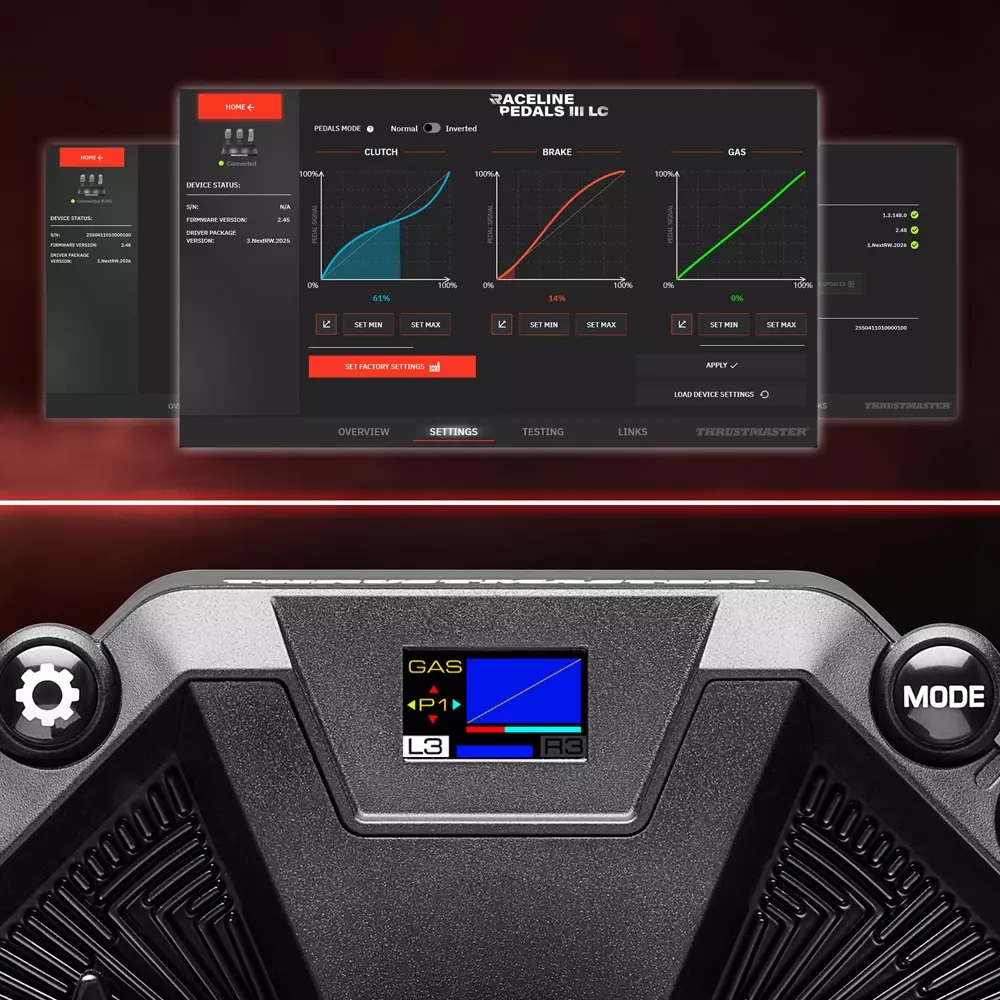 Odkryj pełen potencjał pedałów Raceline dzięki zaawansowanym ustawieniom dostępnym bezpośrednio w aplikacji Race Dash na konsoli T598 lub za pośrednictwem aplikacji My Thrustmaster Panel na komputerze. Dostosuj skok każdego pedału, dodaj strefy martwe i dostosuj krzywe reakcji za pomocą EQUALIZERA, aby precyzyjnie dostroić czułość i zachowanie pedałów w grze.