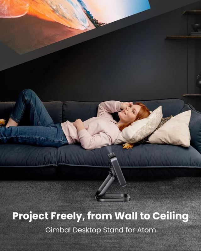 Zrelaksuj się i oglądaj filmy na suficie! Przechylaj i obracaj Atom 360°, aby znaleźć idealny kąt oglądania.